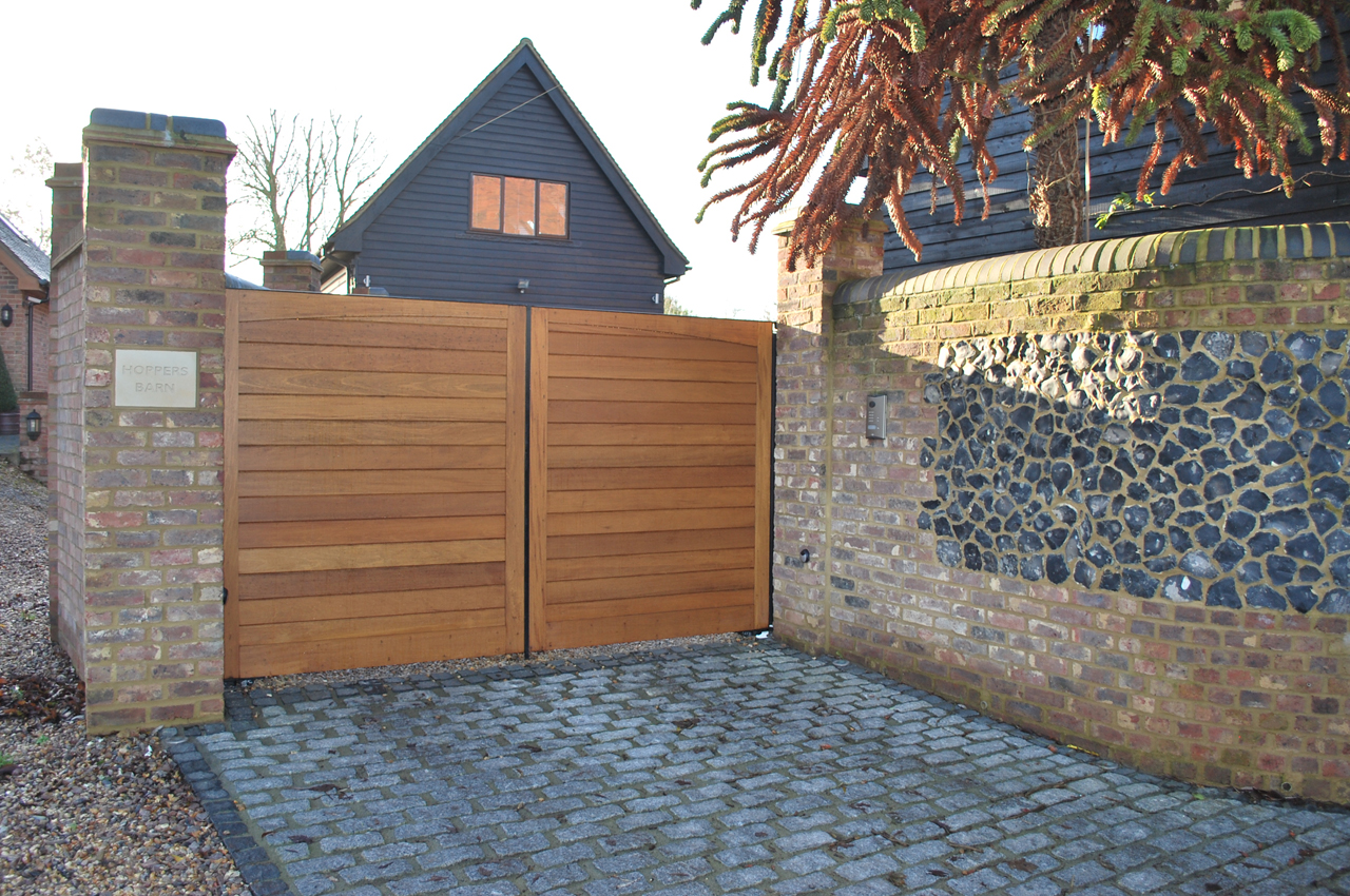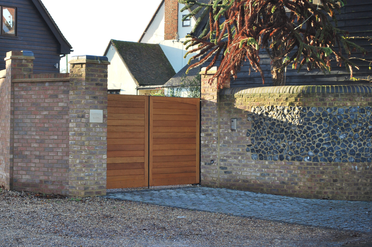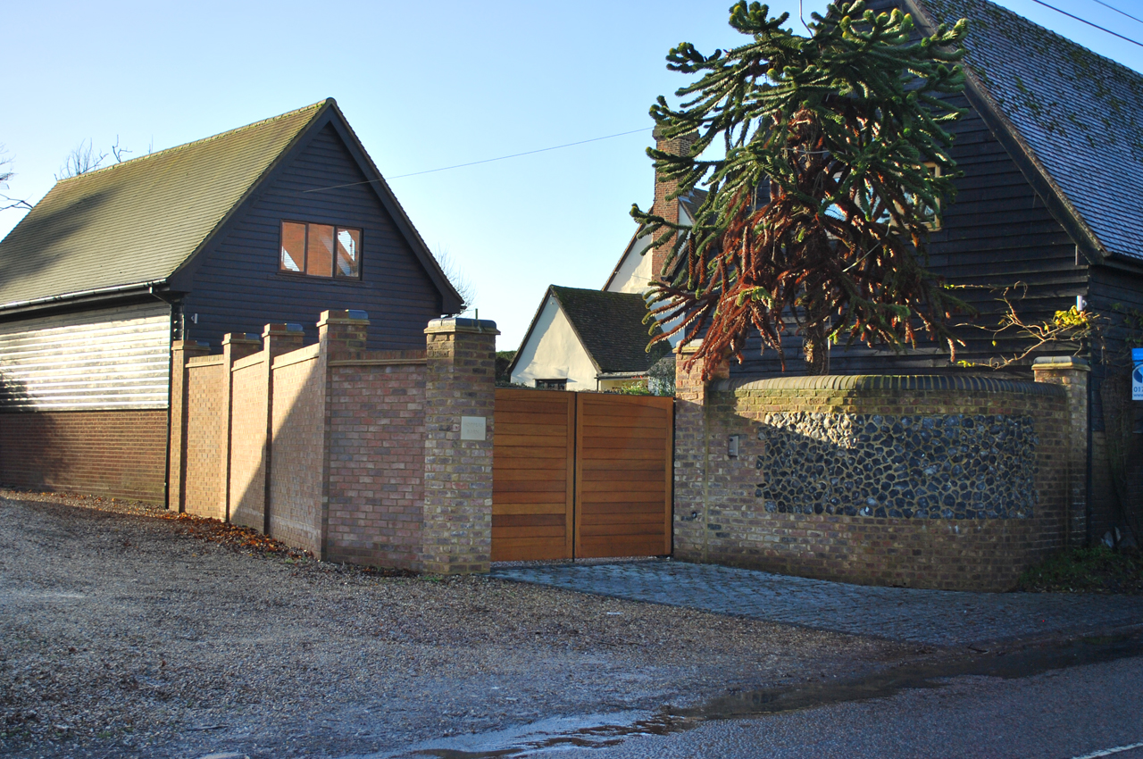 The new boundary wall and entrance gateway was designed as a wall boasting two facades. Flint sand soft reclaimed facing bricks and curved copping stones to compliment the converted barn into which the gateway led, and on the other side and where the wall faces the modern red brick house and open driveway the materials utilised were red factory produced bricks, tile creases and traditional coping bricks to match those details evident on the principal façade of the house.